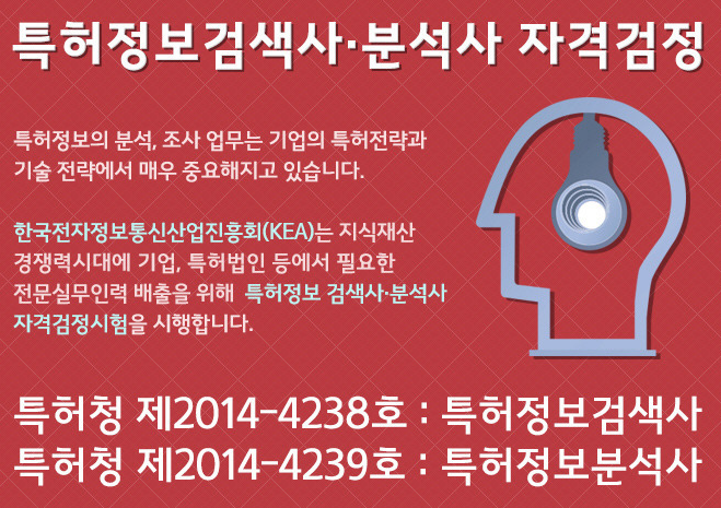 특허전문 인력을 뽑기 위해 한국전자정보통신산업진흥회 특허지원센터에서 특허정보 검색사 및 특허정보 분석사 자격증을 운영하고 시험을 주관하고 있습니다.