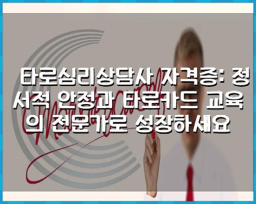 타로심리상담사 자격증은 한국타로자격인증협회에서 발급되며, 공인자격으로 인정받고 있습니다. 이 자격증을 획득하여 정서적 안정과 타로카드 교육 분야에서의 전문성을 증명하세요. 한국타로자격인증협회로 문의하시면 더 자세한 정보를 얻을 수 있습니다.